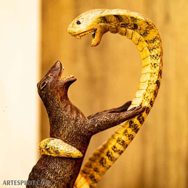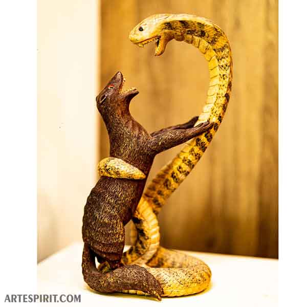Handcrafted Wooden Sculpture ā The Epic Battle of Mongoose vs. Cobra