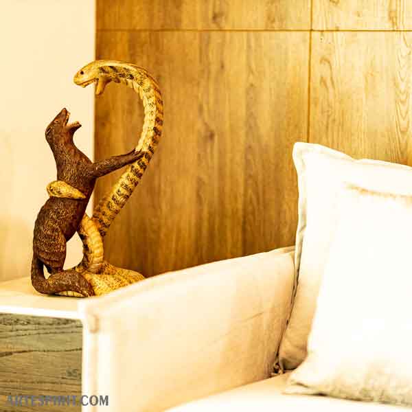 Experience the raw intensity and primal instincts of natureās most iconic duel with this exquisite handcrafted wooden sculpture depicting the age-old battle between a mongoose and a cobra. A timeless representation of agility, survival, and the relentless fight for dominance, this stunning masterpiece brings to life the electrifying moment when these two adversaries engage in a battle of wit, speed, and instinct.